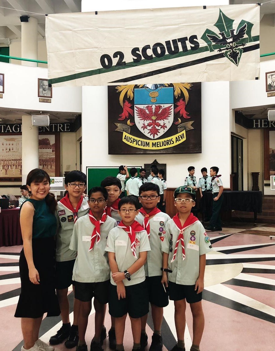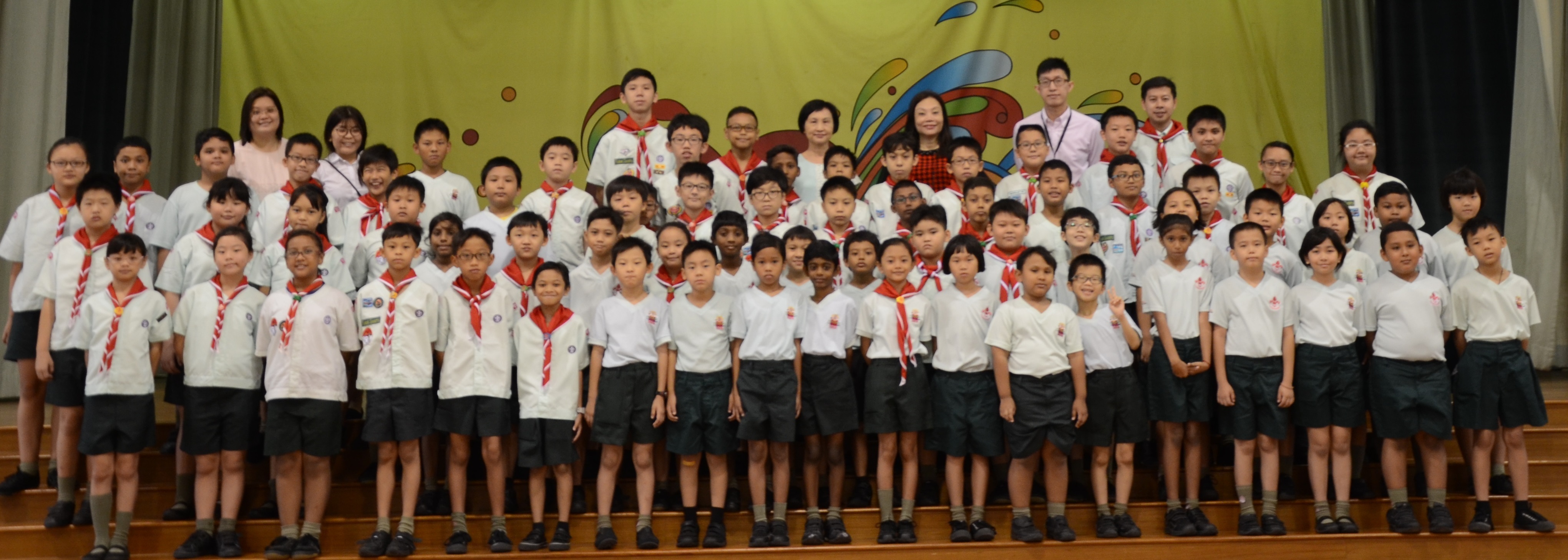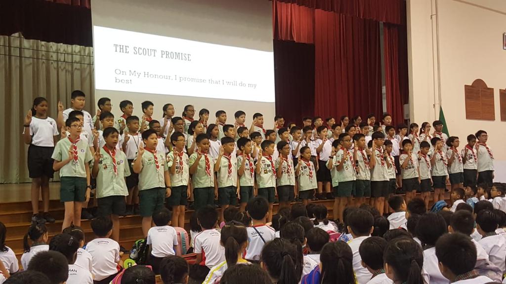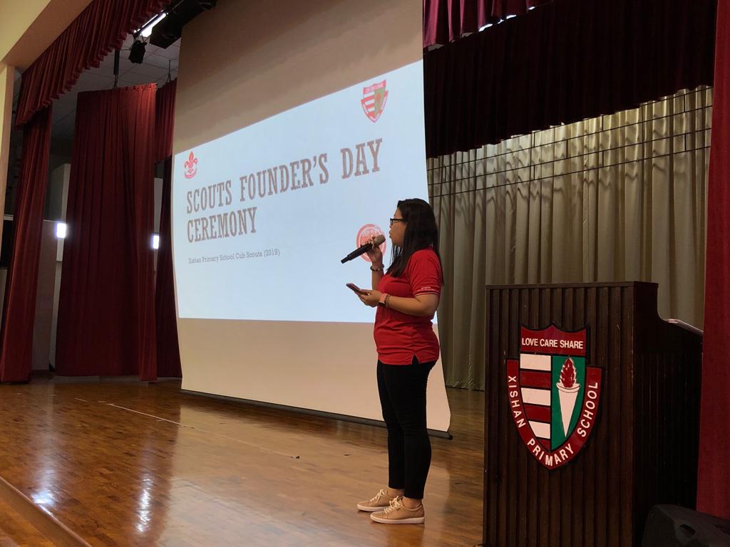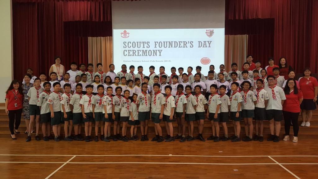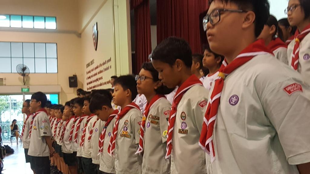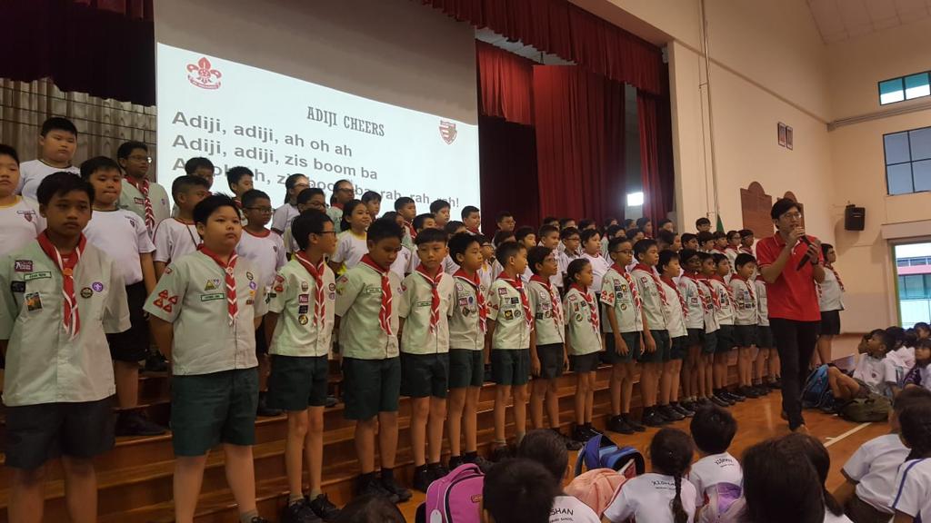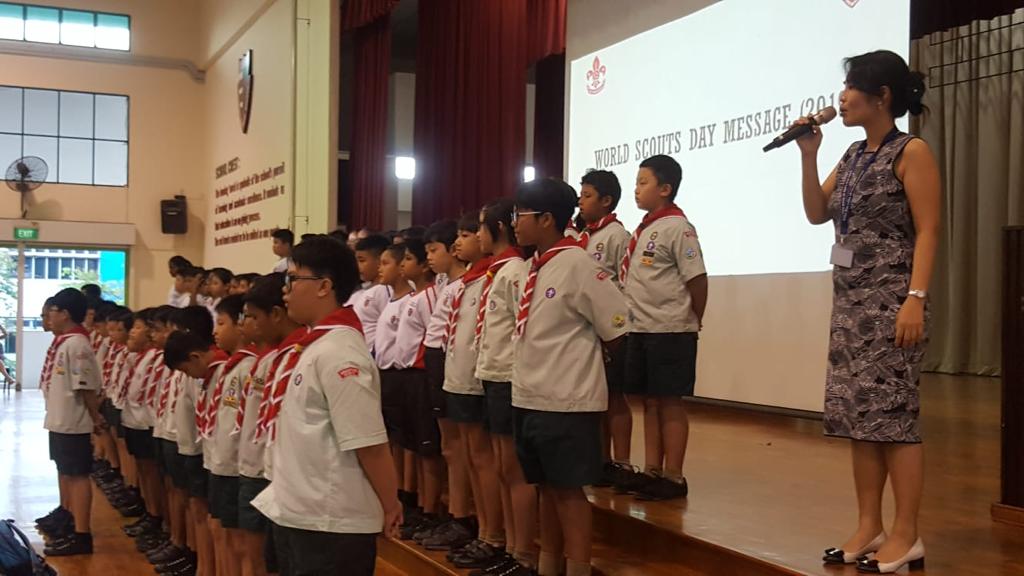 Cub scouts commemorating Founder’s Day today (22 February) during the morning assembly with Ms Soh Hui Min in command, Mrs Quek our Principal delivering the speech and Mr Chan leading the Adiji cheers.