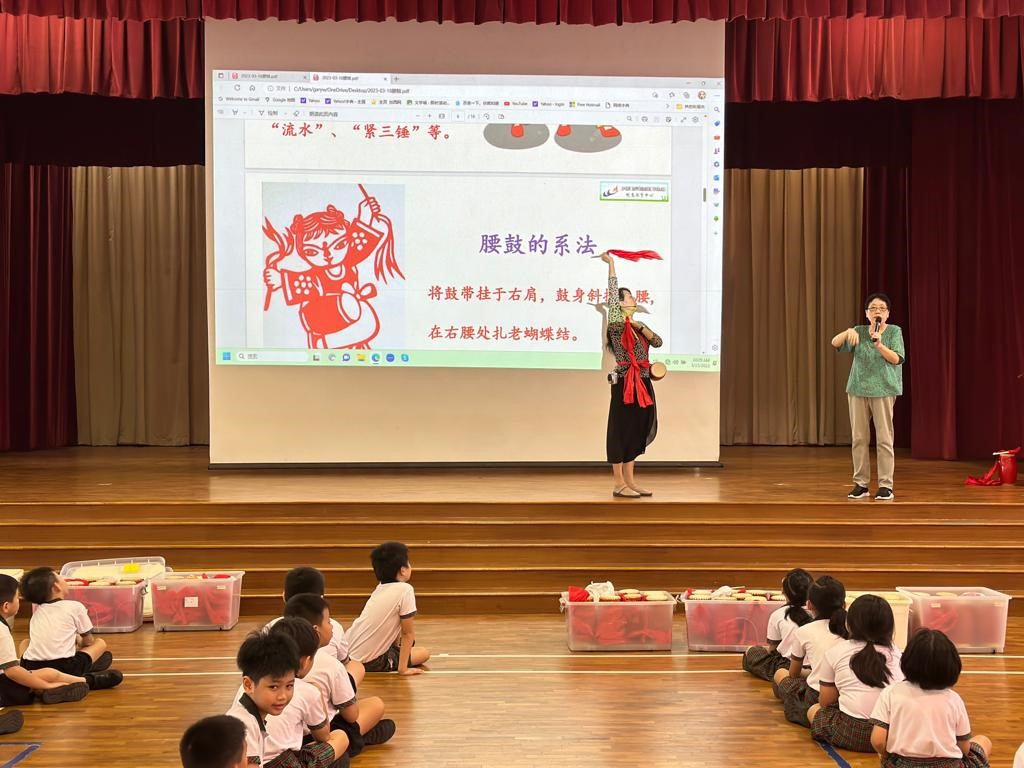 腰鼓是古老的民族艺术,它源于生活,又很好地表现生活。腰鼓舞的最大特点是鼓点与舞蹈动作的和谐配合和紧密结合。 学生们踩着清脆的鼓点,体验华族乐器的独特风格。