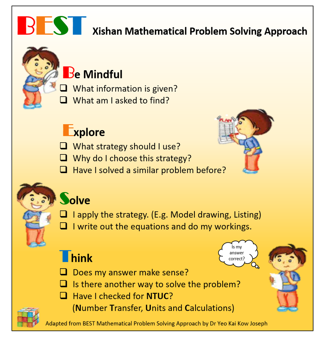 At Xishan Primary School, we use the BEST Problem-Solving Approach to help pupils develop confidence and competence in solving mathematical problems. Through this approach, teachers guide pupils to apply systematic thinking routines and a range of heuristic strategies, enabling them to analyse problems, explore possible solutions and solve mathematics problems.