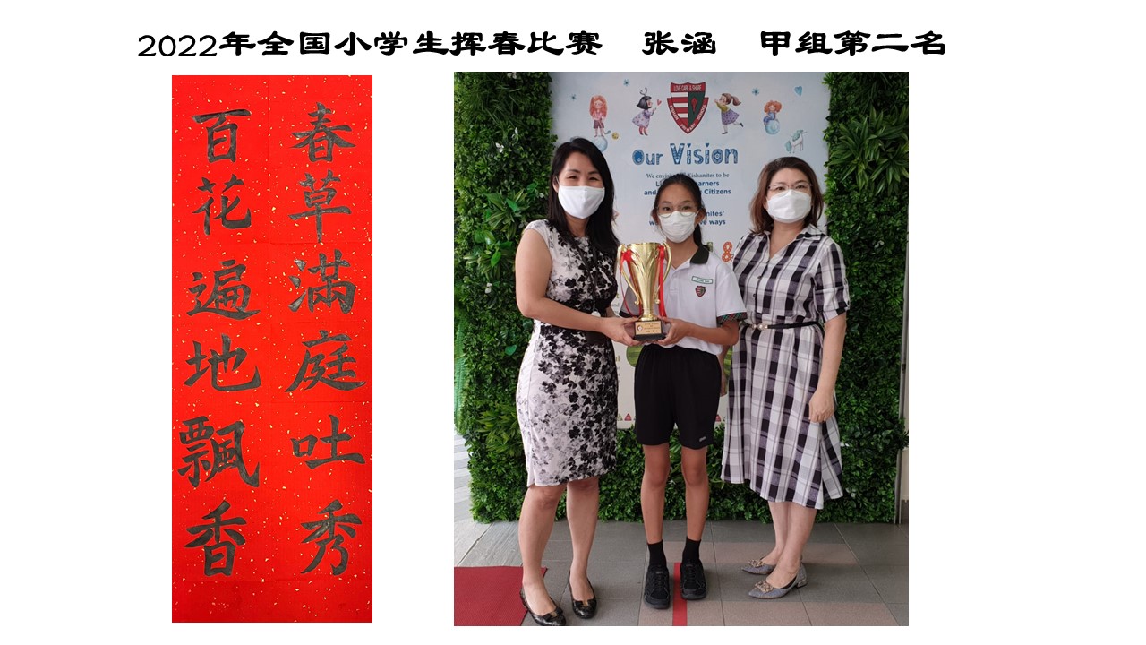 The National Primary Schools Chinese Calligraphy Competition 2022, jointly organised by Hong Wen School and Hong Wen Alumni Association. Our school Zhang Han from Class 6 Self-Discipline participated in this competition and out of 527 participants, she has demonstrated her calligraphy talent and successfully clinched 2nd place.