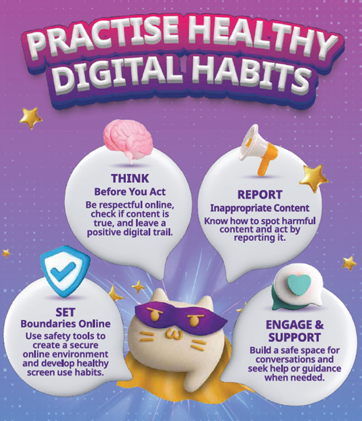 The national theme highlights the importance of building healthy digital habits as a community. Students will be guided to practise the following four healthy digital habits: